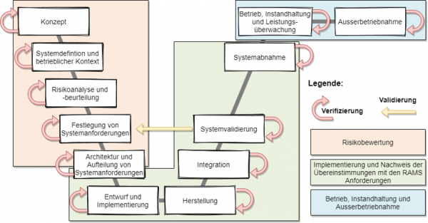 Der generische Prozess wie er in der Prozessnorm EN 50126-1:2017 vorgeschlagen wird, teilt den Lebenszyklus der Systementwicklung in zwölf verschiedene Phasen ein. Die Verifizierung wird jeweils zum Phasenabschluss durchgeführt, wie dies mit den roten Pfeilen in der Grafik ersichtlich ist.