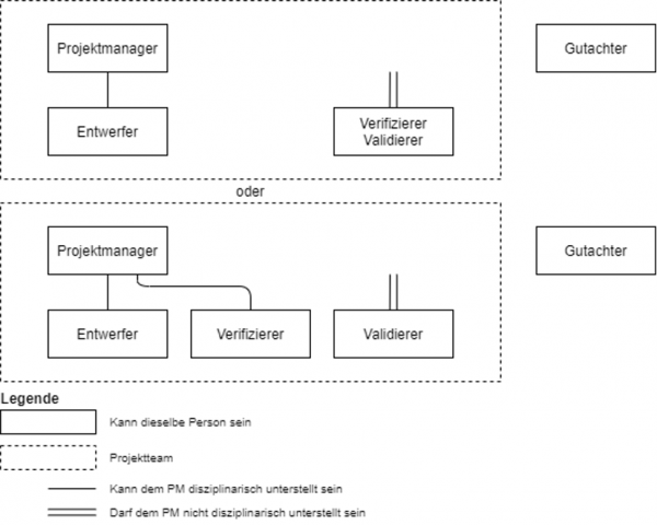 Die Darstellung oben zeigt zwei mögliche Konstellationen, wie die Projektorganisation für eine SIL4 Entwicklung aufgebaut sein muss. Ersichtlich ist hier, dass der Verifizierer grundsätzlich auch dem Projektmanager unterstellt sein darf, sofern die gleiche Person nicht auch Validierungsaufgaben durchführt.