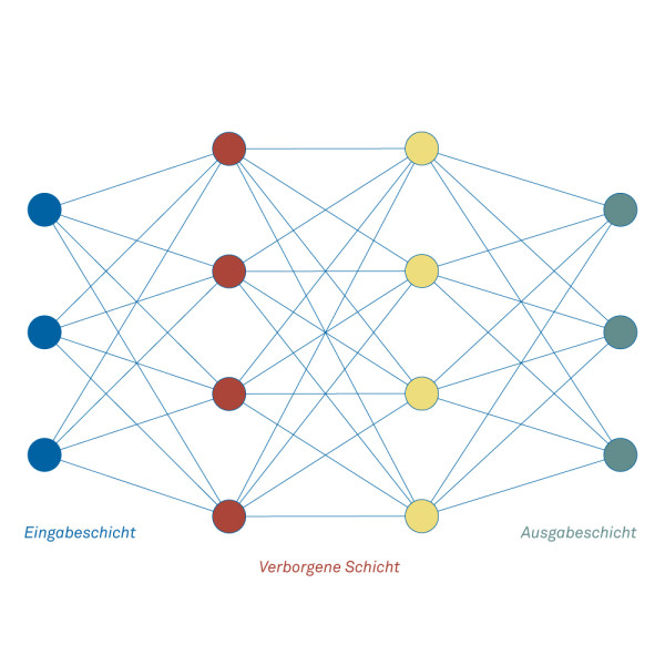 For demanding tasks such as object recognition in images, natural language recognition, or chatbots, neural networks with a significantly higher number of neurons are required. Once a network has more than two hidden layers, it is already referred to as deep learning – though in practice, there are often many more layers.