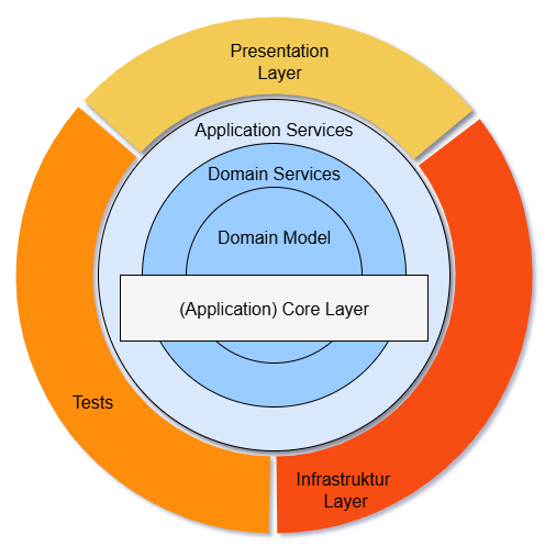 In the core, the business logic and interfaces are defined, which are independent of the technology implementation in the infrastructure layer. At runtime, the implementation is loaded via dependency injection, allowing individual components such as the database to be exchanged without changing the business logic. This concept also allows the business logic to be tested independently of the outer layers.