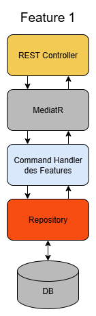 The following example visualizes how the Vertical Slice Architecture works: the REST controller receives a POST request and sends a message to the mediator. The mediator forwards the message to the corresponding handler, which executes the business logic. Finally, the result is written to the database via the repository.