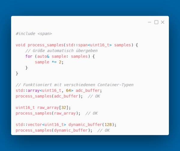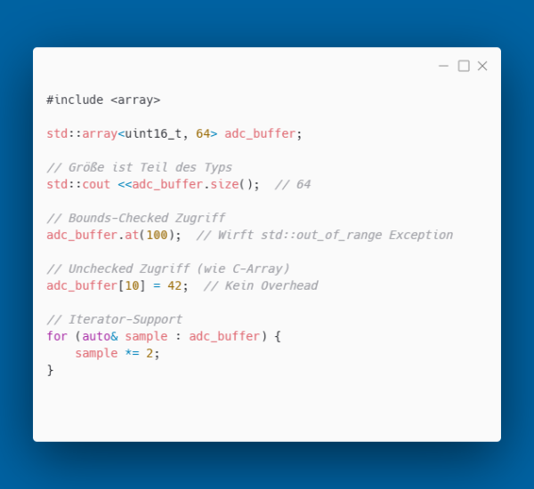 Arrays are ubiquitous in embedded systems: buffers, lookup tables, register mappings. C arrays are unsafe because they have no boundary checks and size information is quickly lost. C++11 introduces std::array and C++20 adds std::span for safe array views.