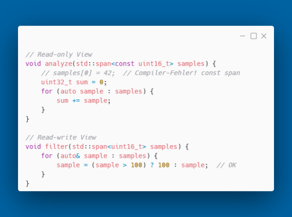 Defensive Programming with at(): In embedded systems, exceptions are often disabled (-fno-exceptions). In case of an out-of-bounds access with at(), the behavior is implementation-dependent. Typically, the standard library calls std::terminate(), which by default terminates the program. This sounds dramatic, but is better than silent data corruption through buffer overflows. With a manual check, you handle cases where out-of-bounds access is expected, and with at() you catch bugs that slip through. With a custom terminate handler, you can define the behavior - such as error logging, safe state, or controlled reset.