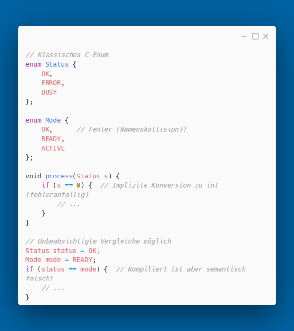 Traditional C enums have several weaknesses: they pollute the global namespace, convert implicitly to int, and offer no type safety. C++11 introduces strongly typed enumerations with enum class.