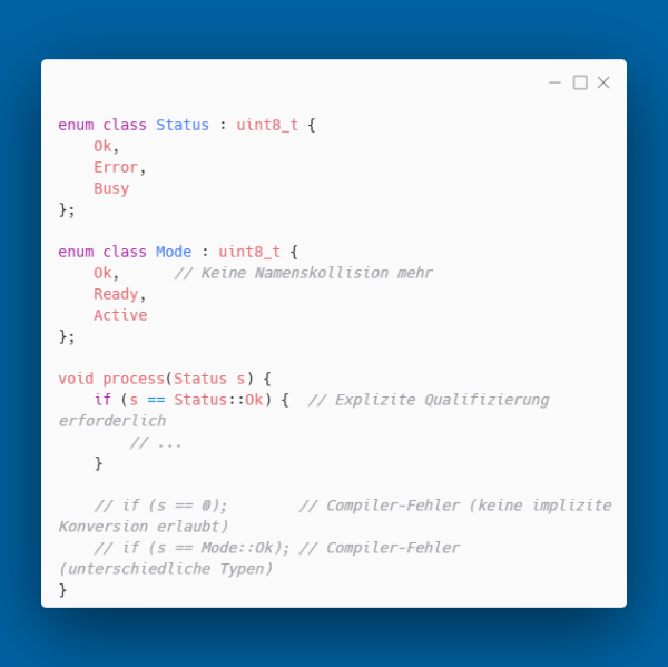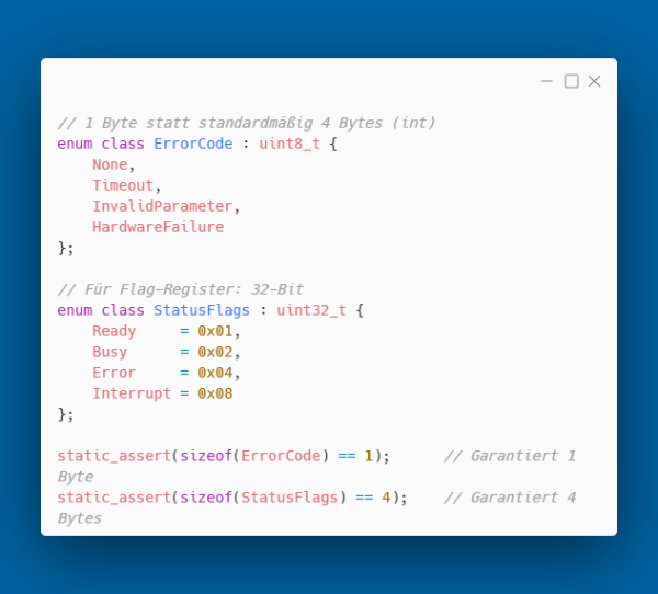 In embedded systems, every byte counts. Enum classes allow explicit specification of the underlying type: