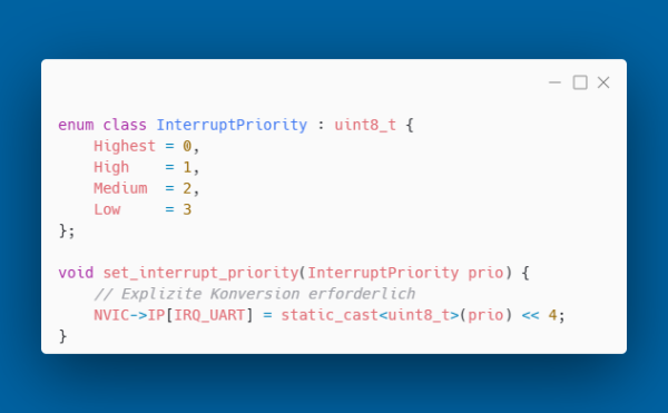 The explicit conversion makes it clear that a type boundary is being deliberately crossed here. C++23 introduces std::to_underlying(), a function that automatically detects the underlying type. Instead of static_cast(prio), you write std::to_underlying(prio), achieving more type-safe and readable code.