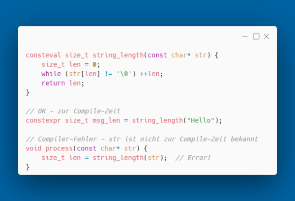 C++20 introduces consteval, a stricter version of constexpr. Functions with consteval must be evaluated at compile time; a runtime call is a compiler error: