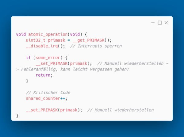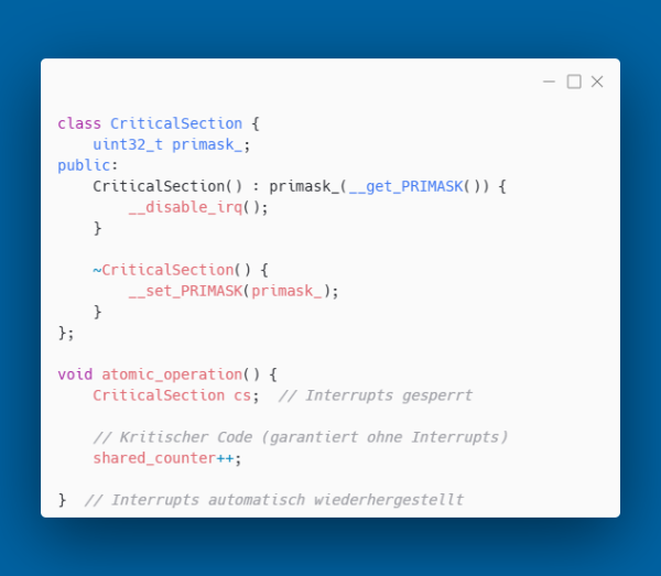 The idea is simple: resources (memory, hardware peripherals, interrupts, mutexes) are acquired in an object's constructor and automatically released again in the destructor. The compiler guarantees that destructors are called, even with early returns. In C, a CriticalSection looks like this: